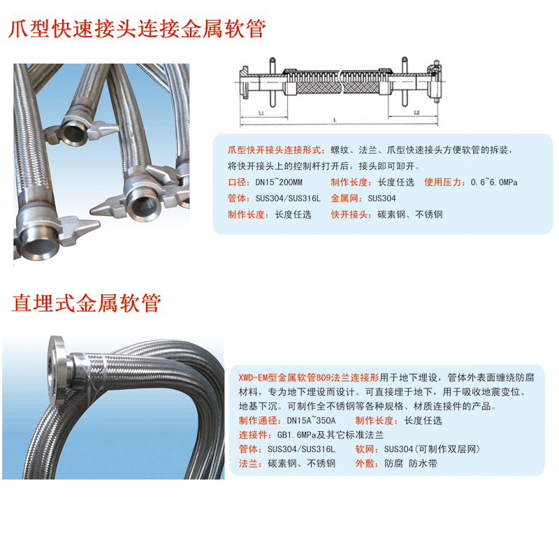 爪型快速连接金属软管是一种安装于液体输送系统的柔性耐压管件,主要用于补偿管道或设备连接端的位移差并吸收振动能量。其通过爪型接头实现快速连接,适用于需频繁拆装的工业场景