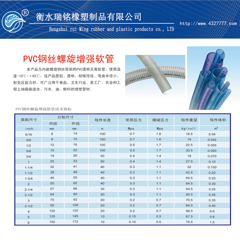 该产品质轻、透明、耐候性佳、弯曲半径小、耐负压能力好。可广泛用于食品、卫生行业、是工厂、农业和工程上抽吸输送水、污水、油、粉料的理想管材。