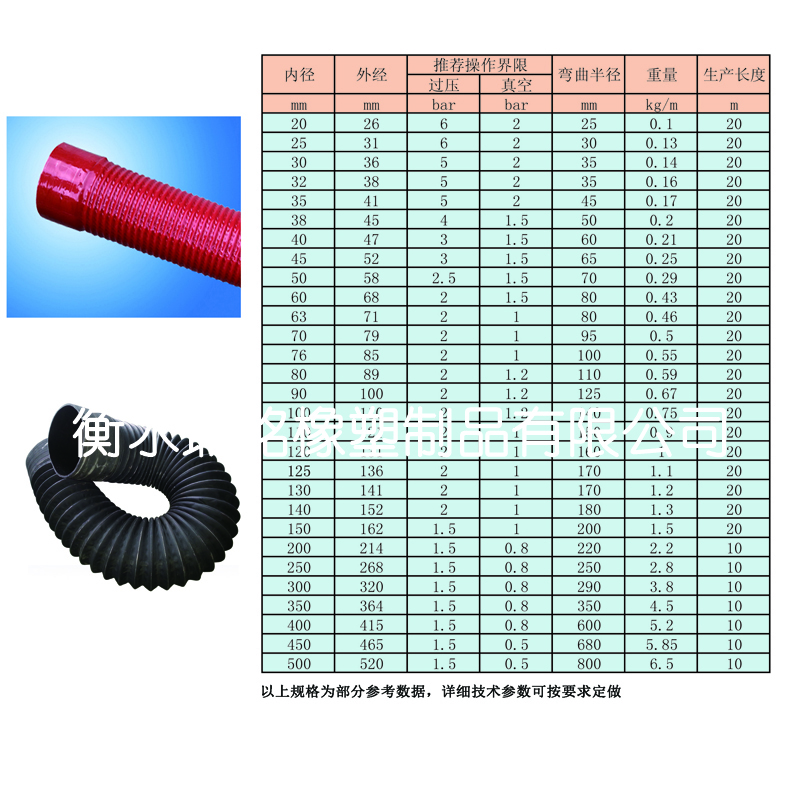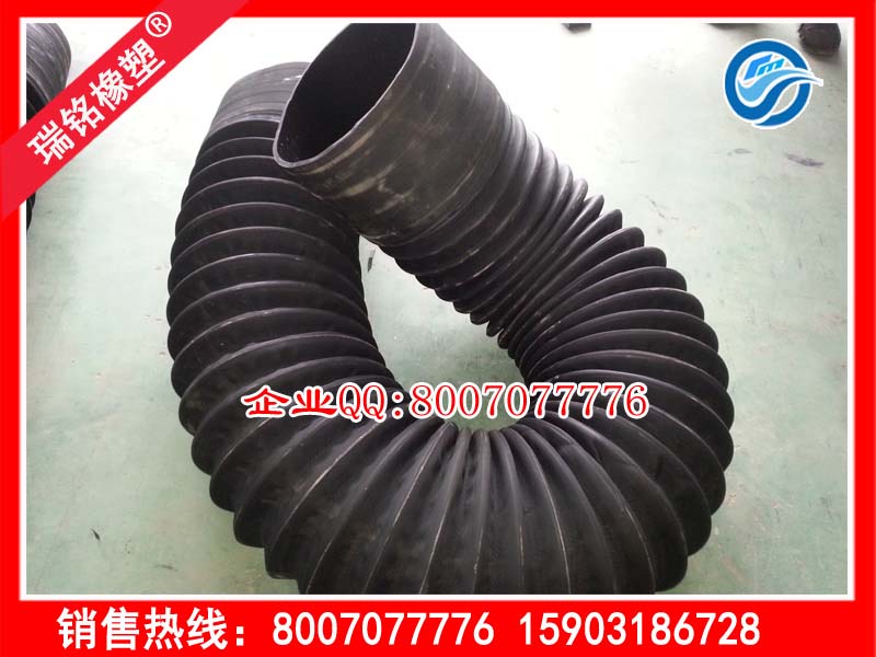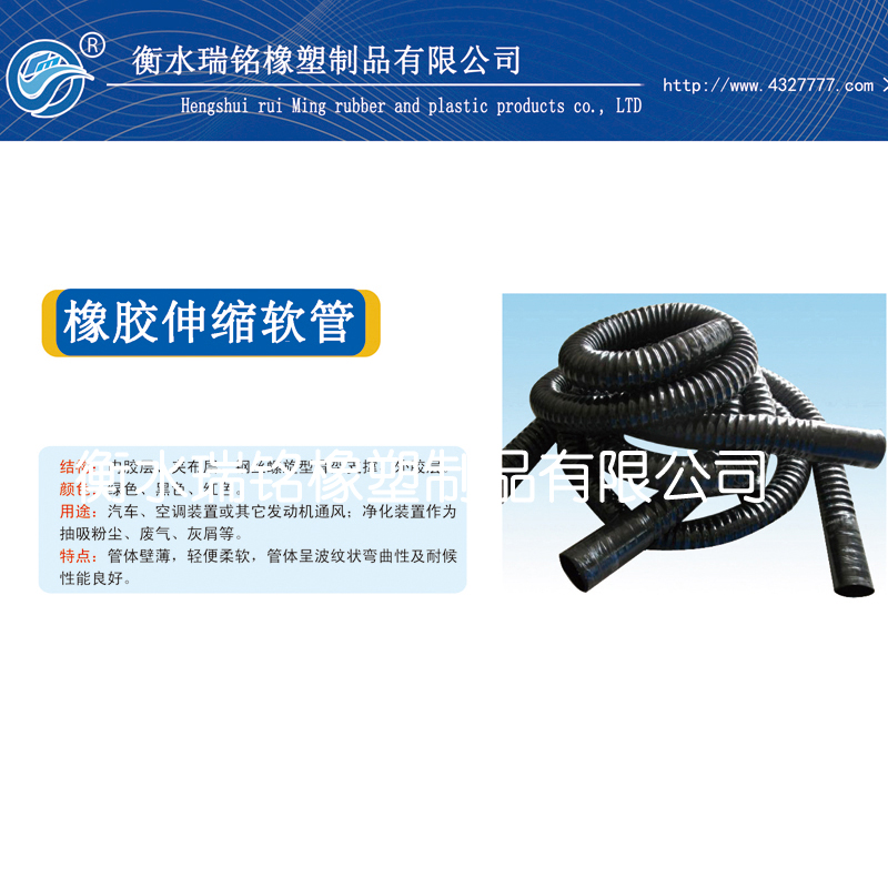橡胶伸缩管性质:极度抗磨损,镀铜钢丝增强软管强度,耐高压、真空和抗压缩,高轴强度优越,令输送物质流畅,良好的抗化学性;弯曲半径约等于3倍外径,可 排静电。构造:以坚固弹性镀铜钢丝包覆于管壁;管壁:特殊聚醚型-聚氨酯,约0.6-0.9MM壁厚,内壁光滑;比普通PVC软管,橡胶管耐磨高10 倍以上;温度范围:约-30℃至+90℃,短时间可达+150℃ 用途:适用于工矿、农业和水利、土木工程、食品、石油、化工、卫生等行业的真空抽吸粉末、颗粒,输送水、油、化工材料、食品等,在农田灌溉、工矿、油库、 抽砂、喷砂、食品、医药及室内的气体、粉末、灰尘吸收排放等领域有着广泛的用途。该产品是PVC、橡胶、金属管材的替代产品。管壁薄、重量轻、变曲性能好。供机车及设备散热器或空气滤清器连接输送空气用。通风管,伸缩管,钢丝伸缩管。里面和外面都是呈波纹形,环保材质,具有耐温耐寒,抗老化,抗静电的作用。用途广泛,主要用来通风,排气,排风,或者吸尘导管。