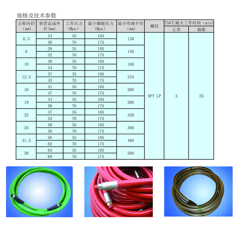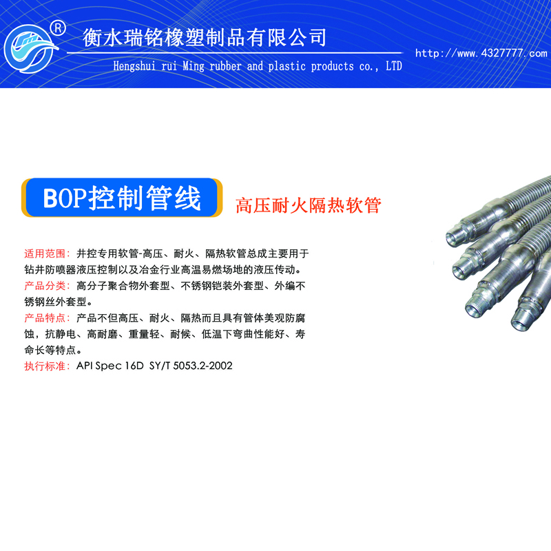 适用范围:井控专用软管-高压、耐火、隔热软管总成主要用于钻井防喷器液压控制以及冶金行业高温易燃场地的液压传动