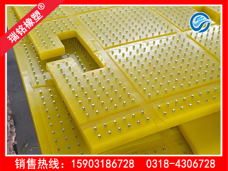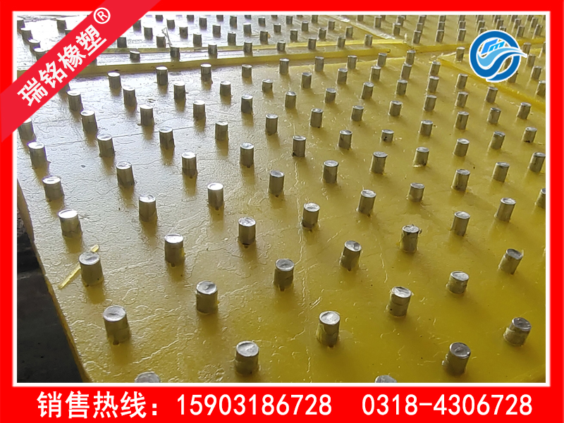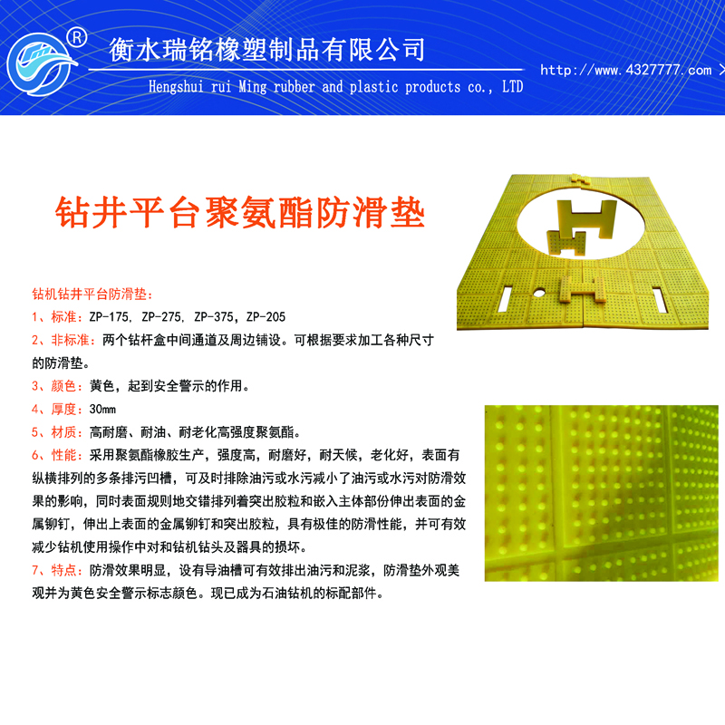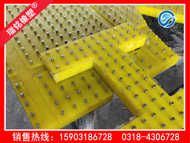 聚氨酯防滑垫系采用聚氨酯板作为主体板,聚氨酯橡胶是橡胶中耐磨的橡胶,具有强度高、弹性好、耐油耐溶剂、低温性能好和耐老化性好等特点。其表面有纵横排列的多条排污凹槽,在主体垫的上表面排污凹槽围成的方形区域内有突出胶粒和嵌入主体部份伸出表面的金属钉组合。突出胶粒和金属铆钉规则地交错排列,突出胶粒的高度和金属铆钉伸出垫块上表面的高度既能有效防滑又可使操作人员站在垫上无不适感觉。