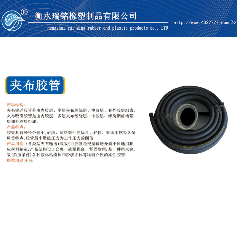 结构:夹布胶管是由内胶层,单层或多层夹布缠绕层和外胶层组成。