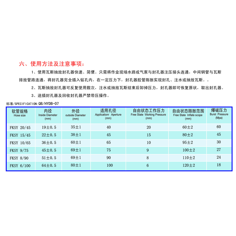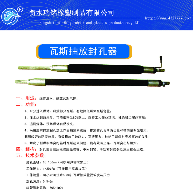 使用方法及注意事项:1、使用瓦斯抽放封孔器快速、简便。只需将作业现场水路或气泵与封孔器注压接头连通,中间钢管与瓦斯排放管路连通,将封孔器完全插入钻孔内,在一定压力下,封孔器胶管膨胀实现封孔、注水或抽放瓦斯。2、瓦斯抽放封孔器可反复使用数次,注水或抽放瓦斯结束后卸掉压力,封孔器即可恢复原状,取出封孔器3、送插封孔器及回收封孔器严禁带压操作