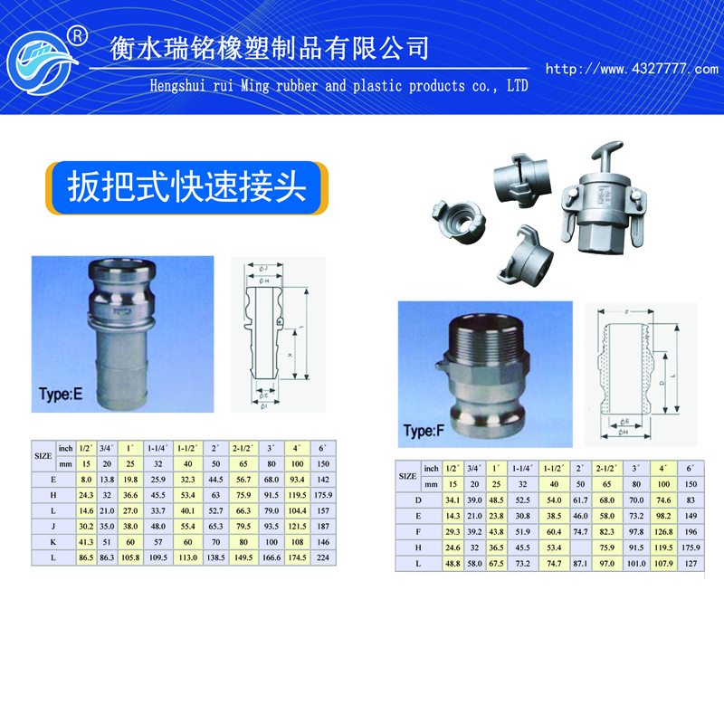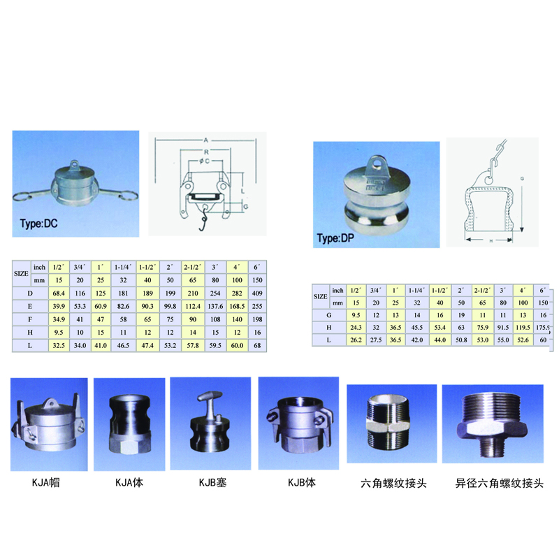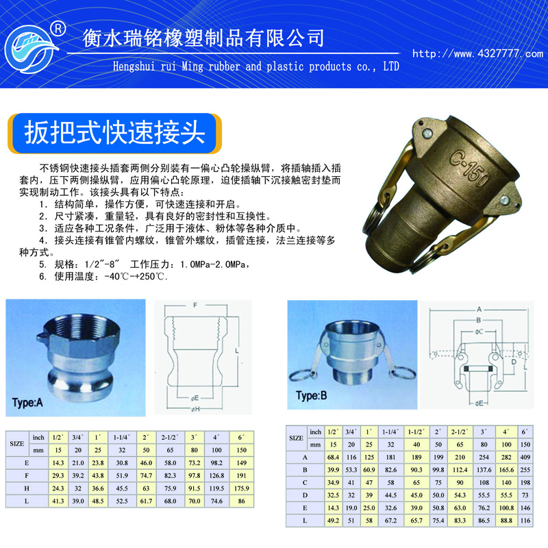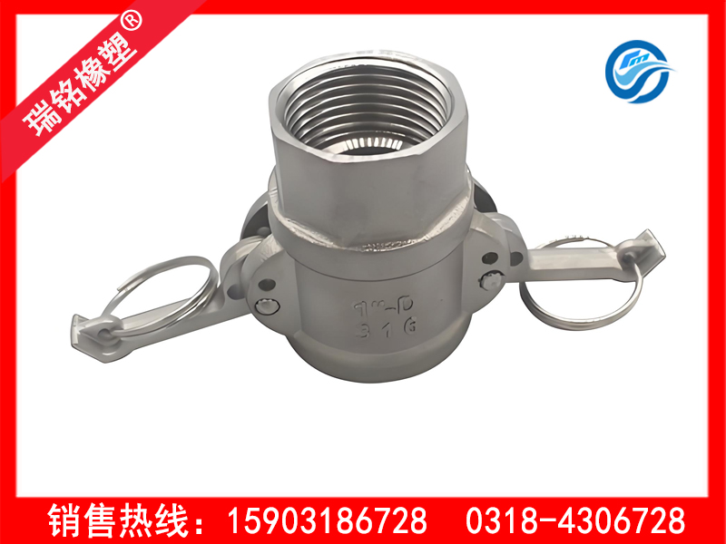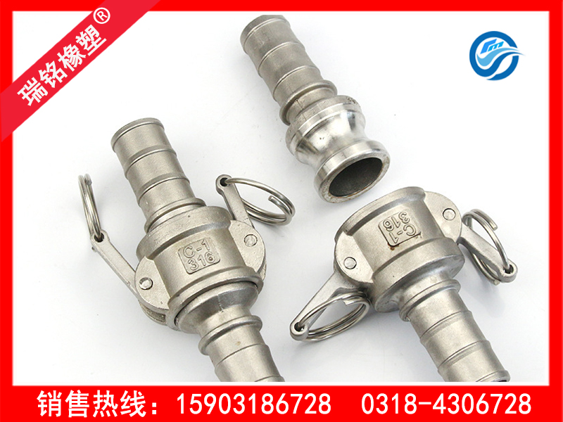 不锈钢快速接头插套两侧分别装有一偏心凸轮操纵,将插轴插入插套内,压下两侧操纵臂,应用偏心凸轮原理,迫使插轴下沉接触密封垫而实现制动工作