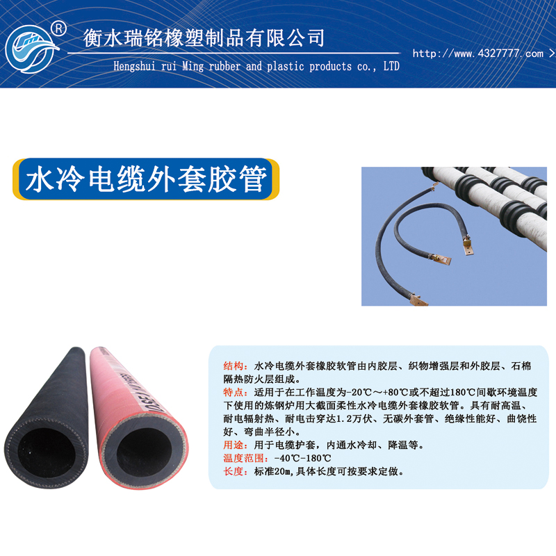 水冷电缆外套胶管具有耐高温、耐电辐射热、耐电击穿达3万伏、无碳外套管、绝缘性能好、曲饶性好、弯曲半径小的特点