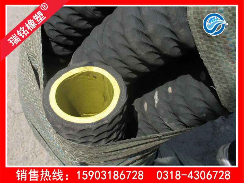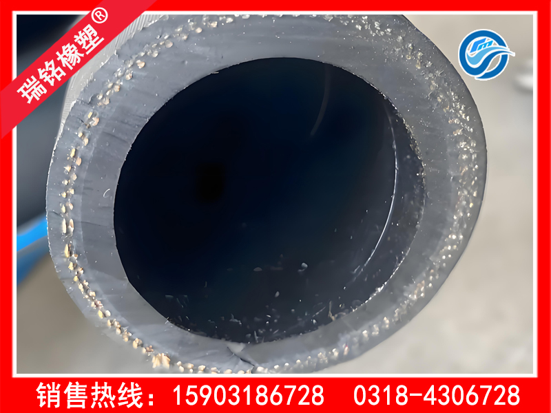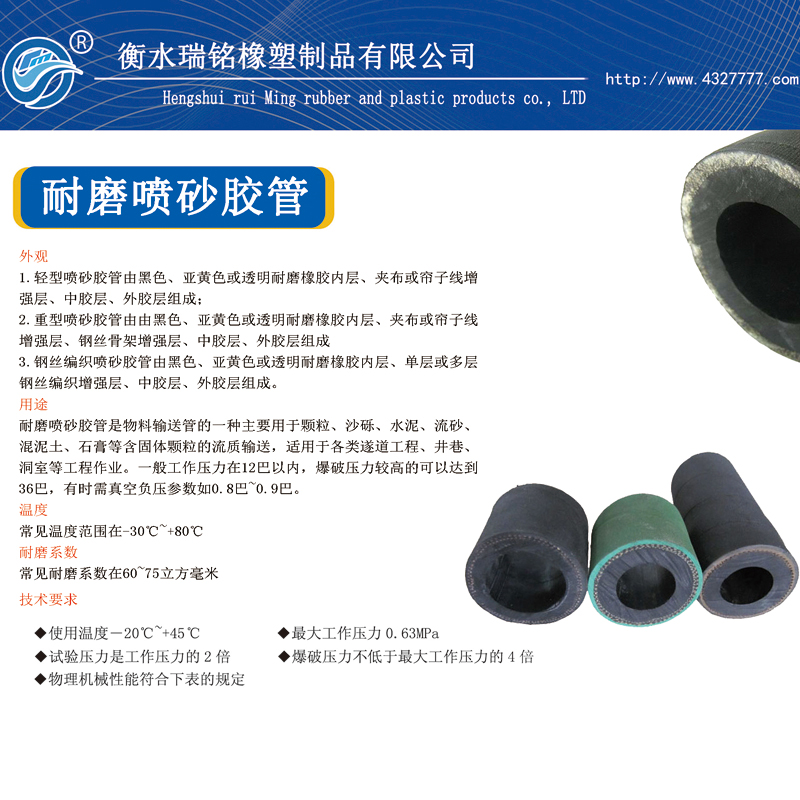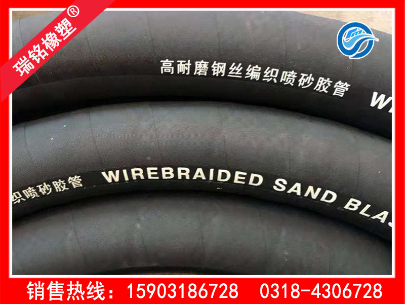 喷砂胶管采用优质擦胶布作增强层,柔性好、承压能力强;螺旋钢丝骨架支撑,采用螺旋钢丝,并在其表面涂覆特殊活性剂使其和外胶层的硫化粘结性能加强;外胶层采用耐磨耐候的复合橡胶,保证其在苛刻恶劣的环境下不产生龟裂。