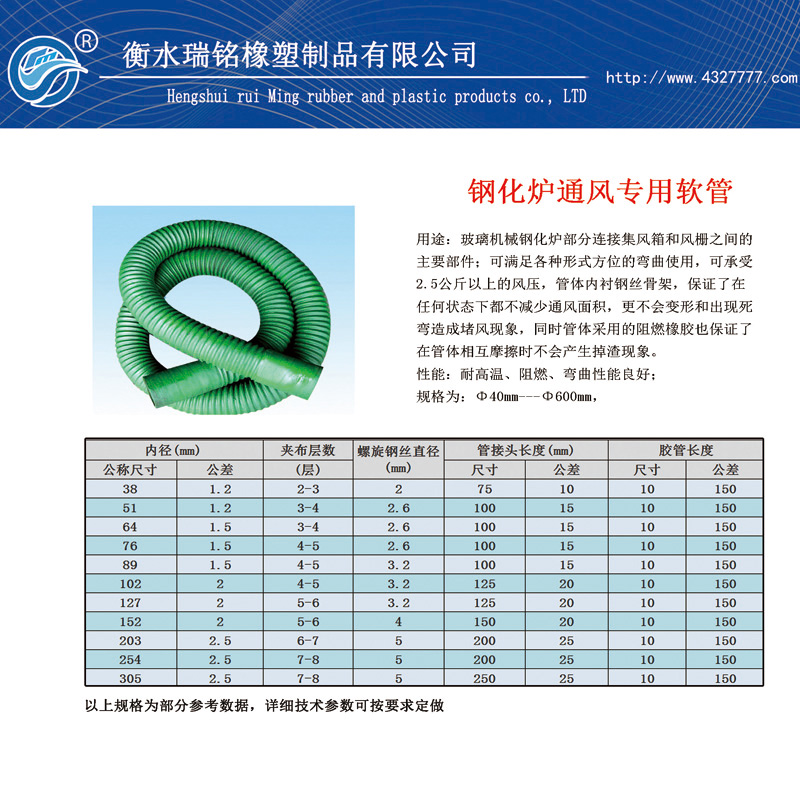 橡胶伸缩软管常用于玻璃厂钢化炉、煤矿、隧道、地铁工程、井下局部进行压入式导向通风,以及净化设备抽吸粉尘、废气、灰屑等