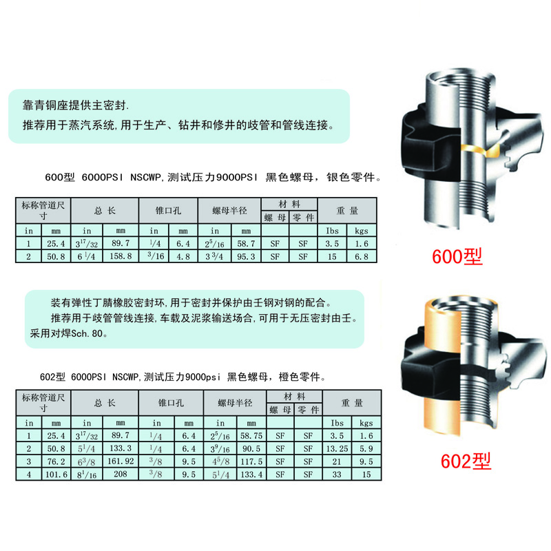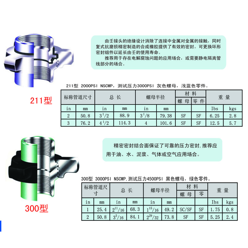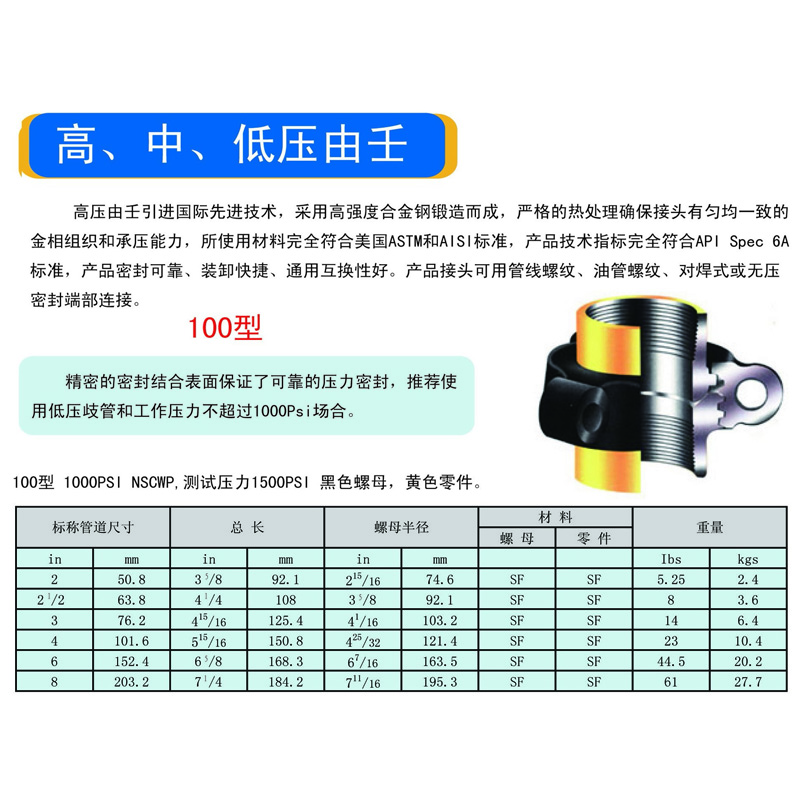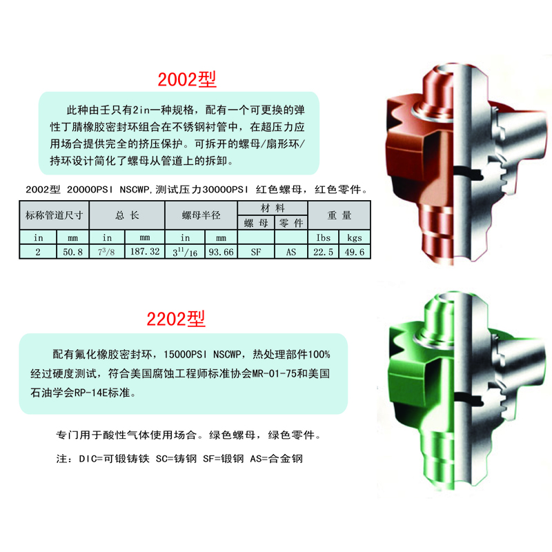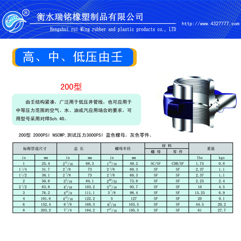 由壬结构紧凑,广泛用于低压管线,也可应用于中等压力范围的空气、水、油或汽应用场合的要求。产品接头可用管线螺纹、油管螺纹、对焊式或无压密封端部连接。