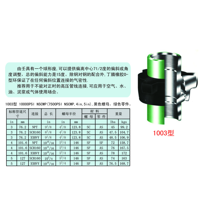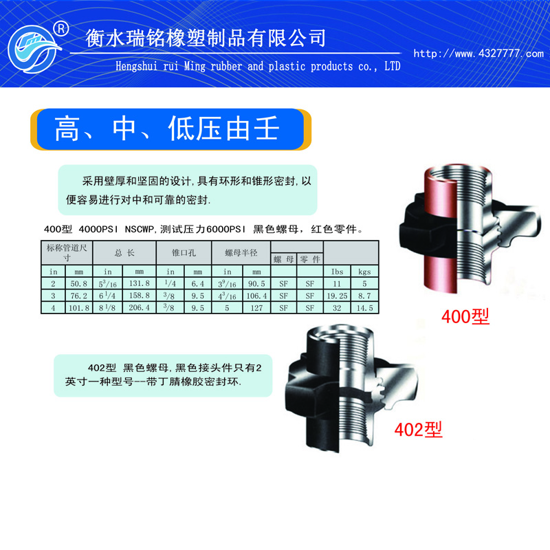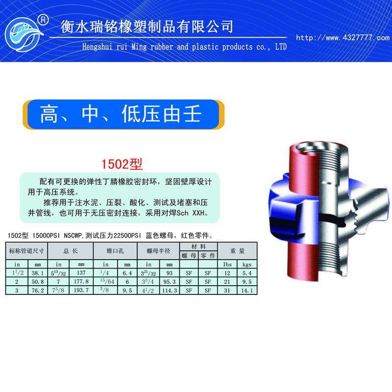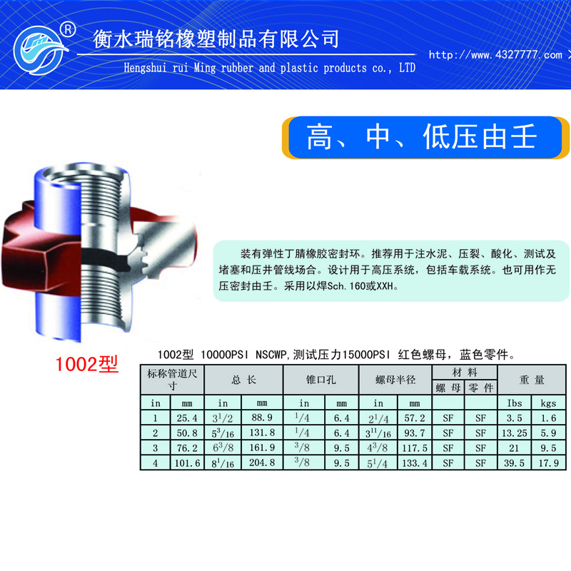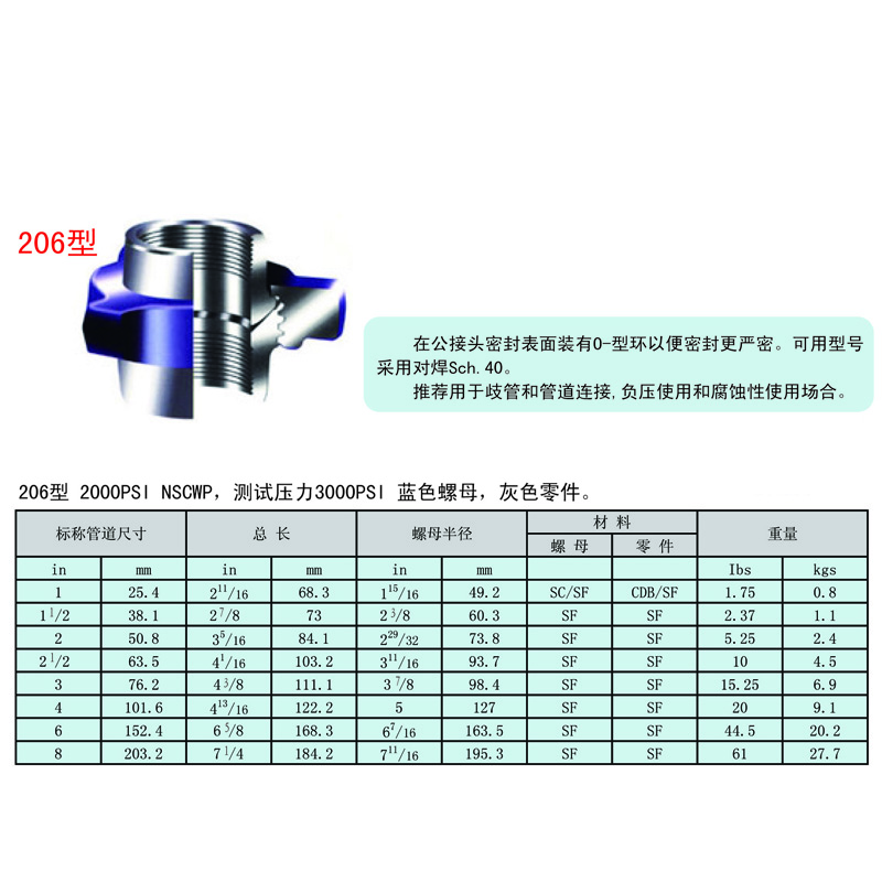 由壬结构紧凑,广泛用于低压管线,也可应用于中等压力范围的空气、水、油或汽应用场合的要求。产品接头可用管线螺纹、油管螺纹、对焊式或无压密封端部连接。